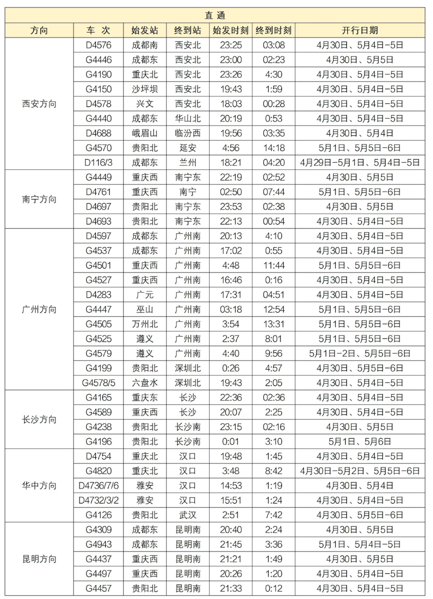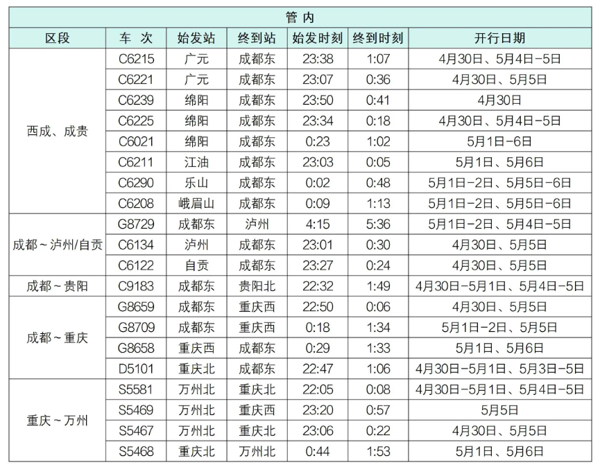 据悉,为全力做好五一假期铁路运输服务保障工作,成都局集团公司精准研判川黔渝“两省一市”客流特点,科学制定运输方案,动态实施“一日一图”,通过突出重点、动态优化、错峰补能、夜动助力等方式,按梯次投放运力,计划开行旅客列车1077对,同比增加35对;增开旅客列车243对,同比增加31.5对,比2026年清明假期增加26对。